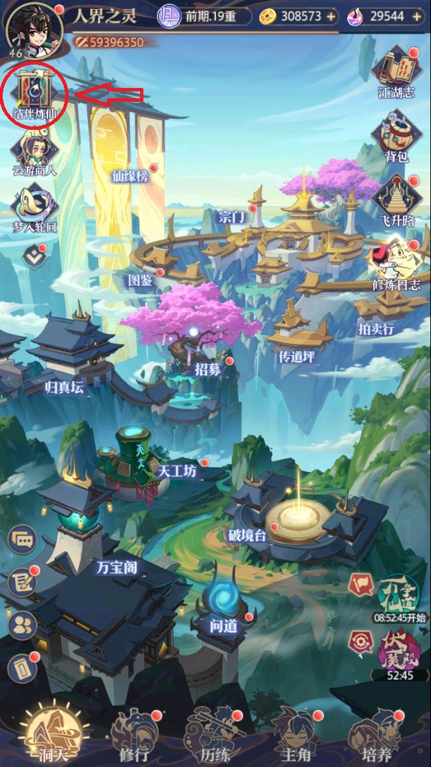 ①使用测试期间的充值账号登录《炼仙传说》手游,并在洞天页面找到【结伴炼仙】栏;