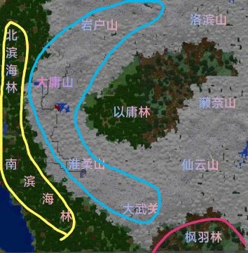 (黄圈:咸鱼村 蓝圈:塞斯乌达 红圈:枫羽)