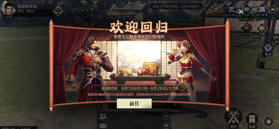 不用担心!因为各种原因暂离《真・三国无双 霸》的小霸王们,在本次周年版本的更新中,项目组已经特地准备了专属回归福利,助力各位小霸王轻松升级,快速追赶游戏进度。