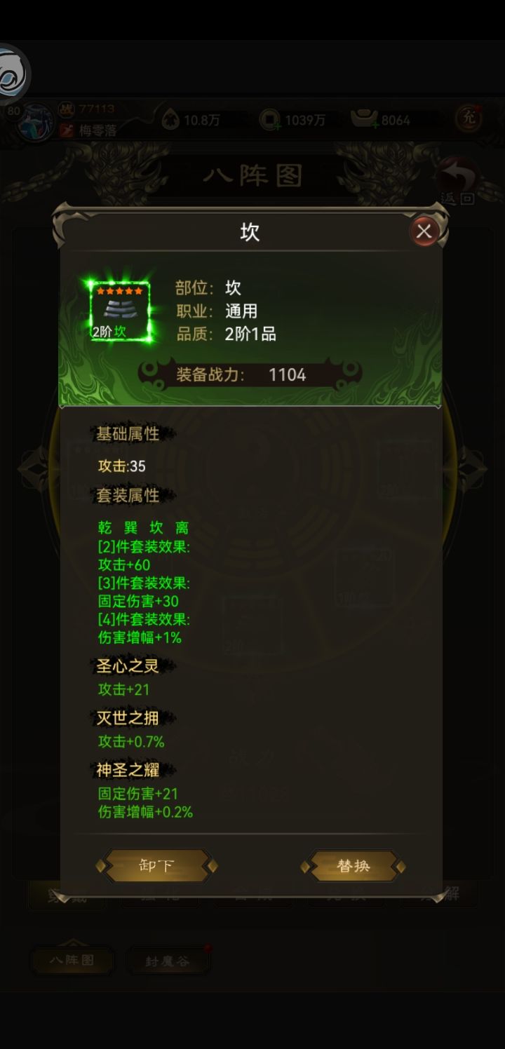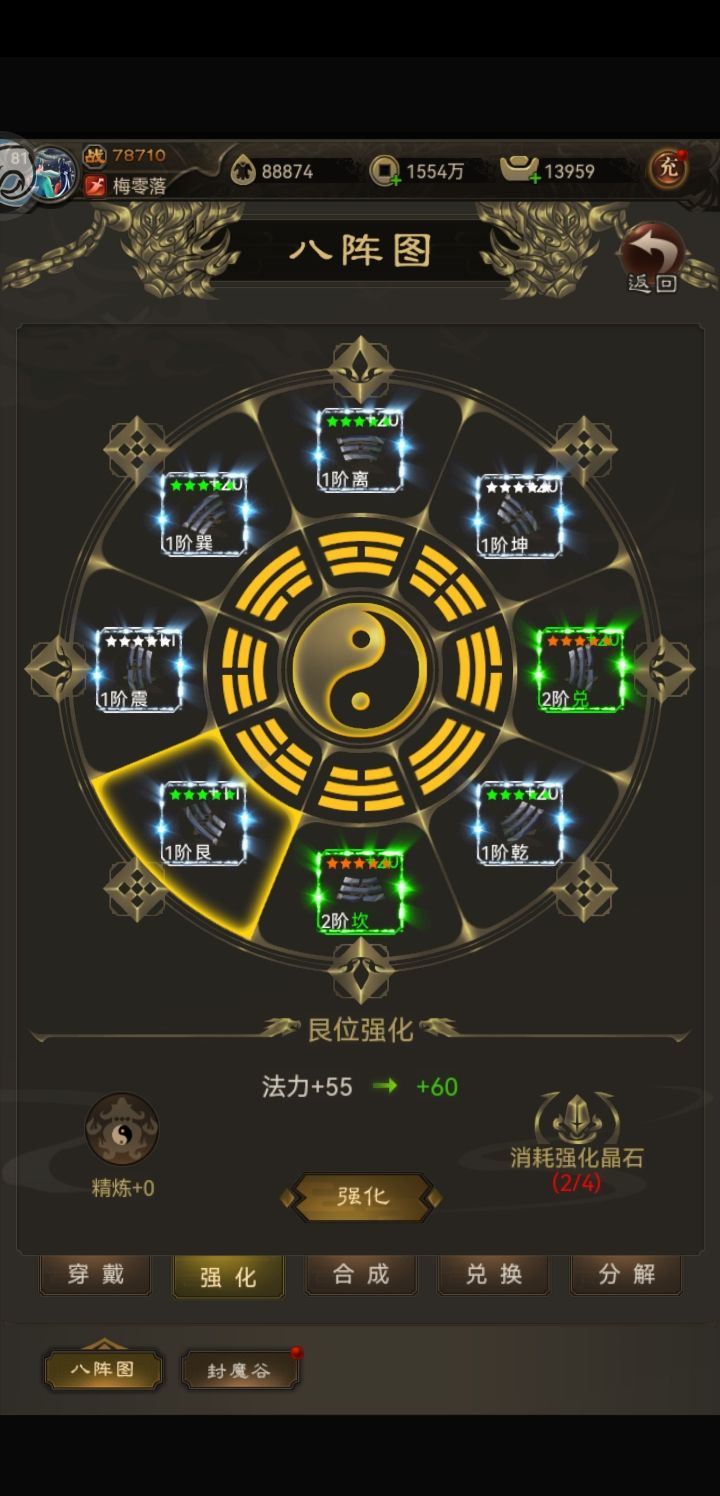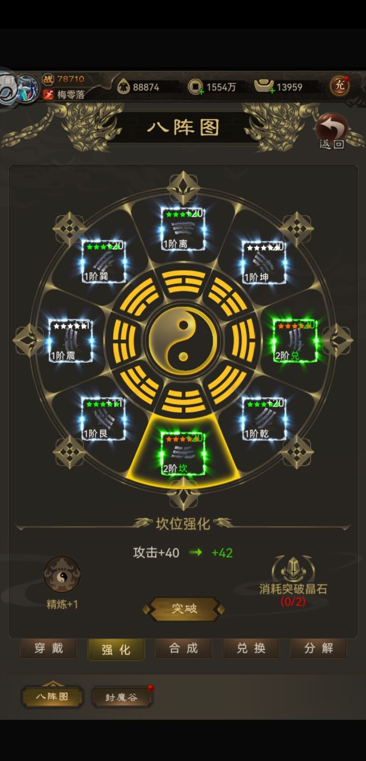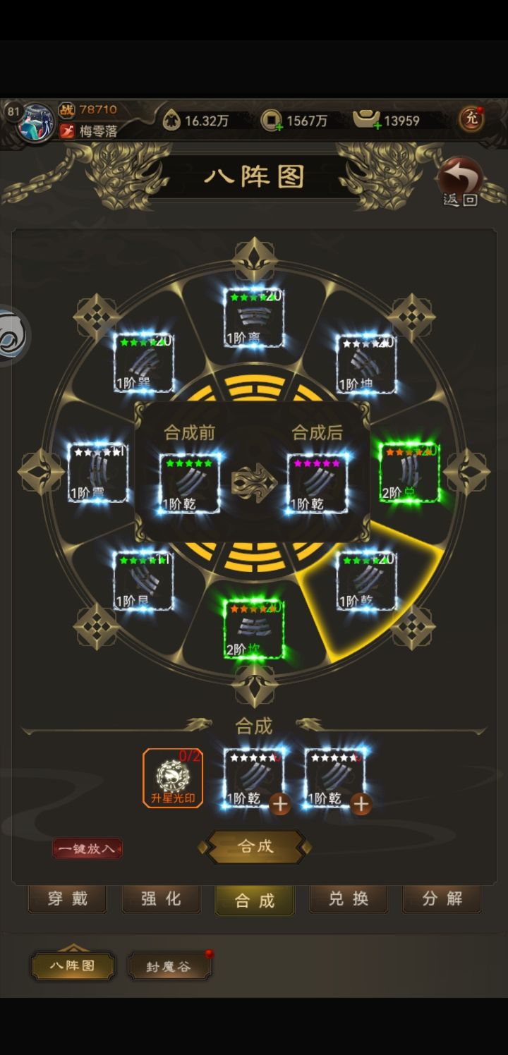 八卦阵里的每一块,都可以通过消耗对应的本体材料合成,升品。额外需要的材料是【升星光印】每次合成/升品可以带属性的属性的增加或者词条的增加,在这里会出现稀有属性【伤害增幅】。