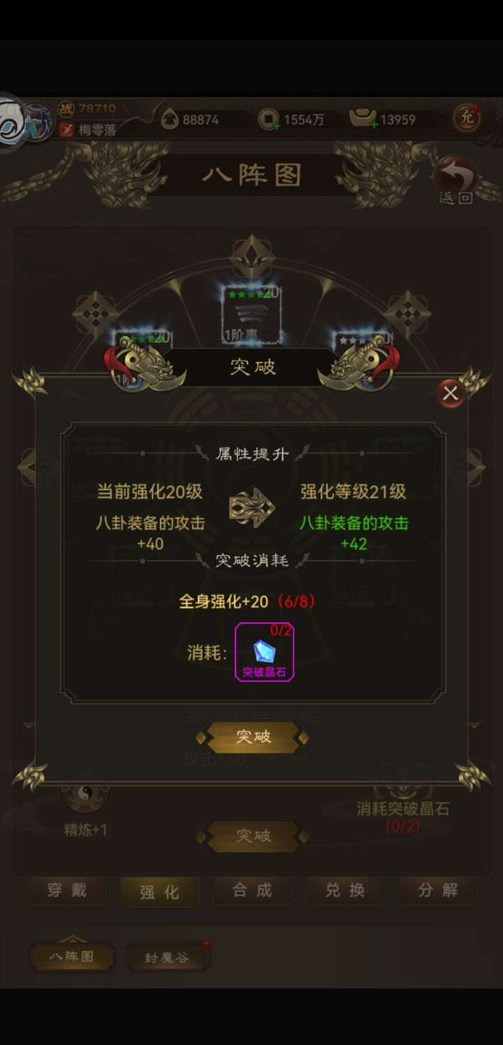 当8块全部10级时,需要【突破】才能继续用强化石继续强化,目前由于我八阵等级不高,突破到21仍然是需要2个突破石,但是根据游戏里的消耗逻辑,30级突破应该是4个突破石。具体可以看图: