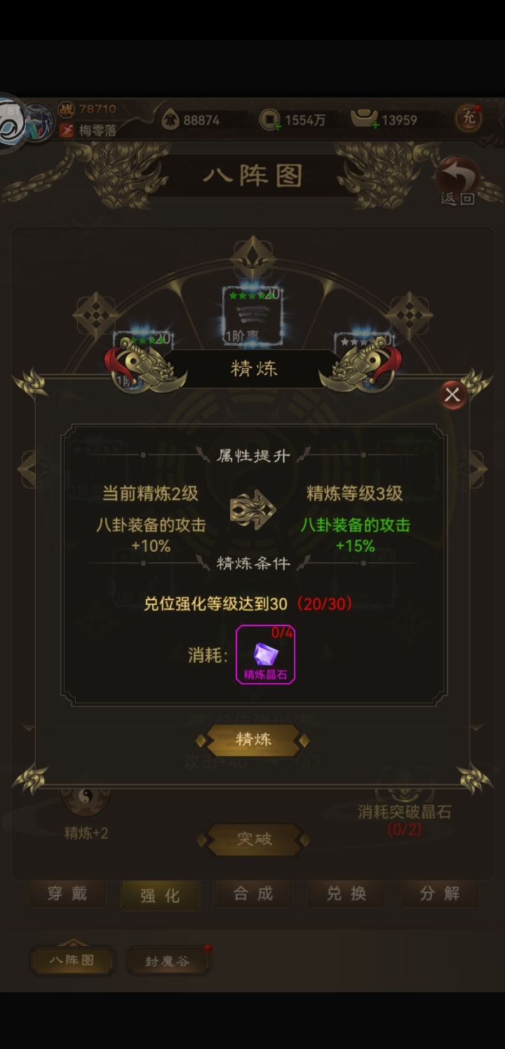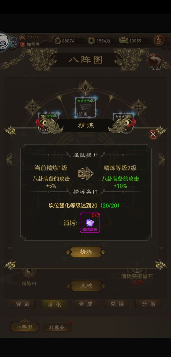 八卦阵图里,每个阵图,每10级都可以进行一次精炼,总共8个部位精炼,其中:兑,乾,坎和震4个部位加攻击5%,巽,离,坤和艮4个部位加生命5%,这里的攻击和生命并不是直接按角色面板属性计算,而是基础【八阵装备】的属性加成。每次精炼的加成是按5%的系数递增,如:1级是5%,2级是10%,3级为15%,以此类推。