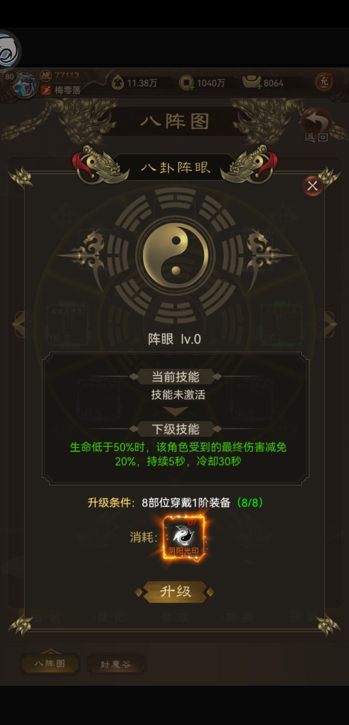 最后说一下【阵眼】,当八块图阵达到统一的阶级以后,可以通过【阴阳光印】开启【阵眼】,开启后会获得一个被动:当角色生命值低于50%,获得5秒的大幅的【最终伤害减免】,目前这个【阴阳光印】获取途径主要是获得排名获取。