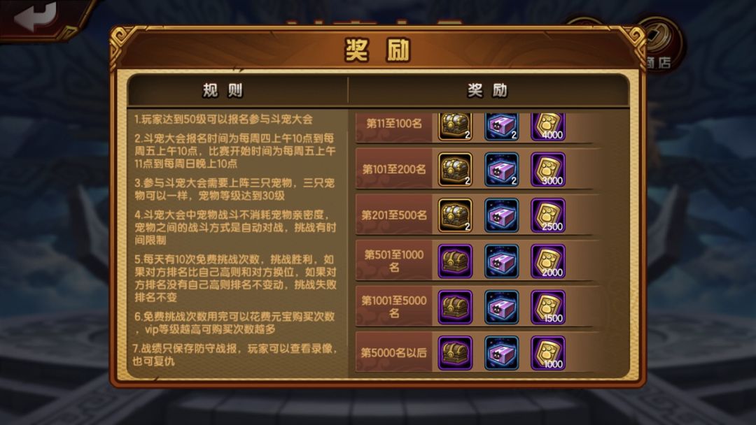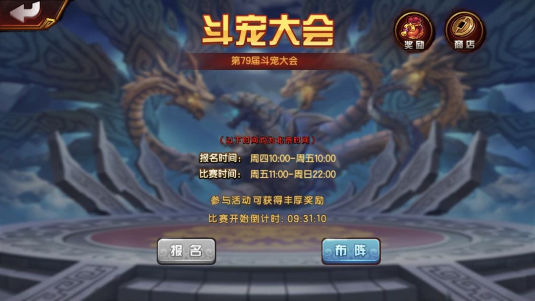 斗宠大会:报名参赛,通过战斗和排名获得斗宠勋章,内丹盒子、装备盒子