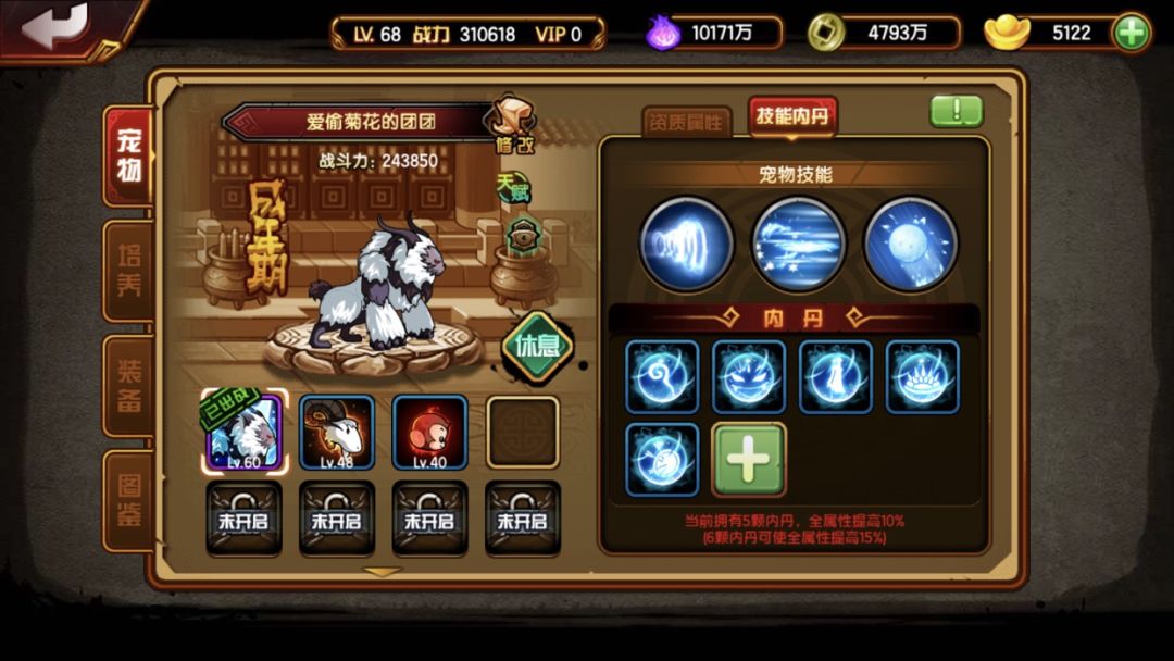 内丹:赋予宠物被动技能,不同内丹技能不同。提高属性(如下图)