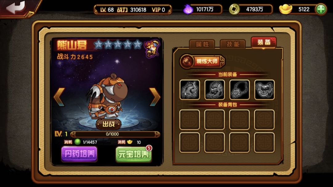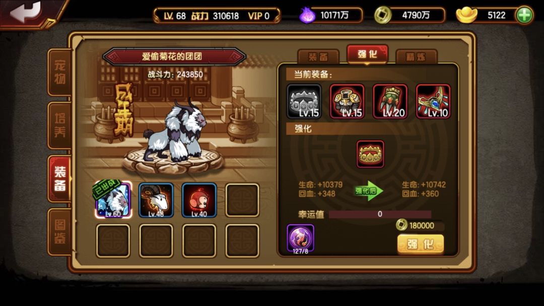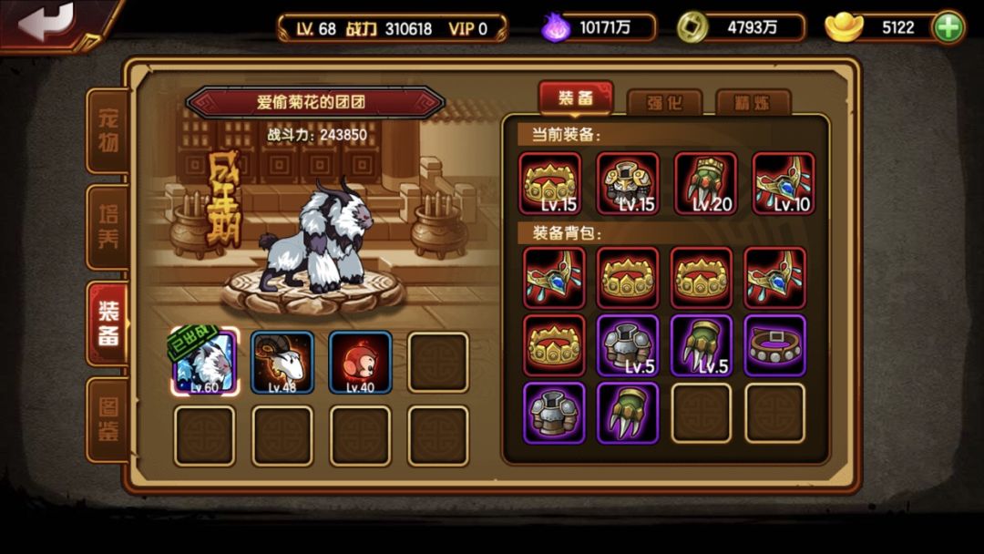 (4)宠物装备:分为紫色、橙色、红色,通过斗宠大会奖励以及斗宠商店购买获得;可以消耗道具对装备进行强化和精炼,材料通过孽镜台获得,也可通过四人副本之狮驼岭鹏王获得