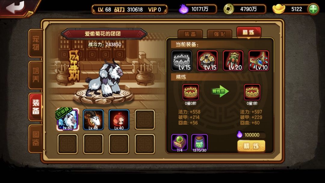 宠物装备精炼:消耗清微石、拂绿水和灵魂,对宠物装备进行进阶