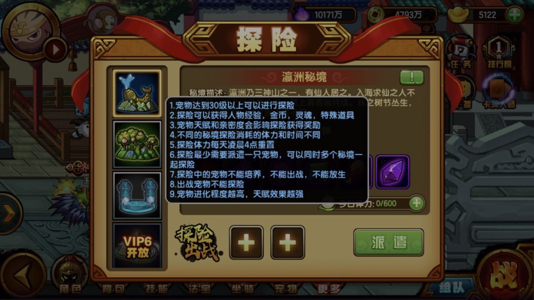 3、探险(主界面“更多”-“探险”),派遣宠物探险可以获得道具和经验奖励,具体如下图(探险体力也可通过体力丹恢复),探险的秘境随着角色等级不断开启,等级越高,秘境奖励越好;vip玩家有专属秘境,消耗体力更多,奖励更好。
