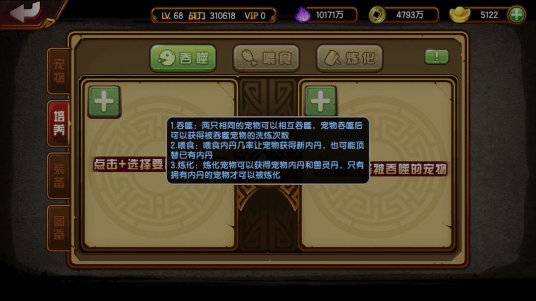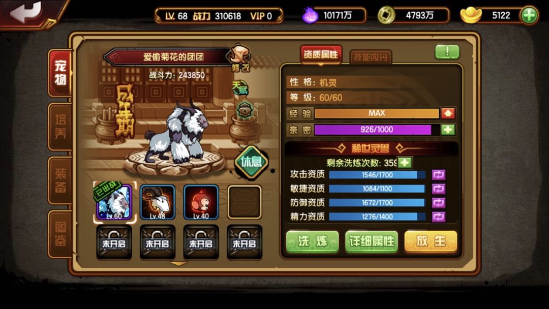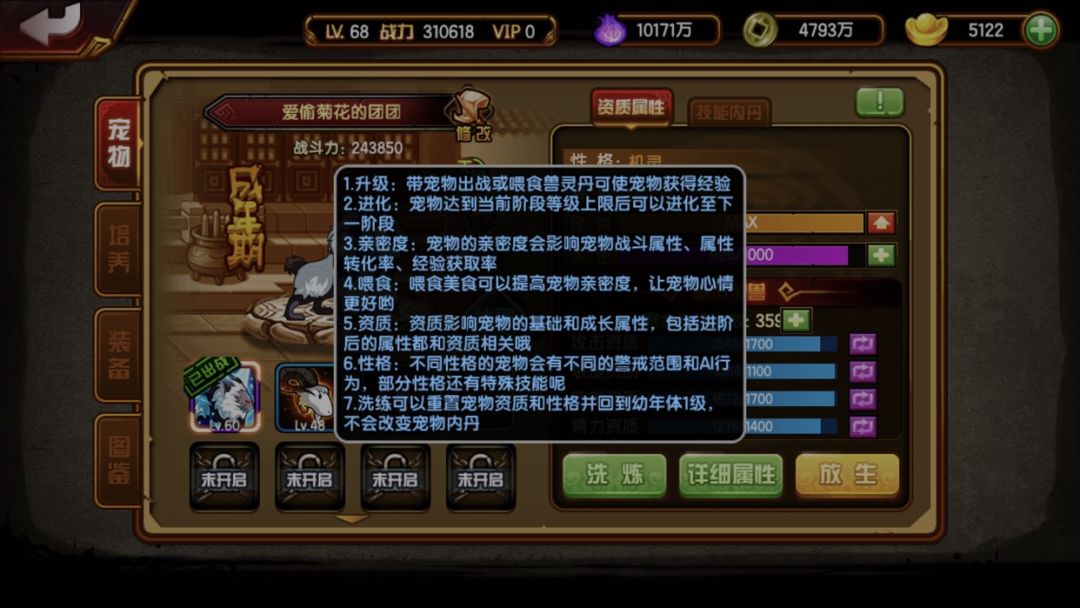 2、宠物的升级、进化、亲密度、喂食(亲密度后加号)、资质、性格、洗练介绍: