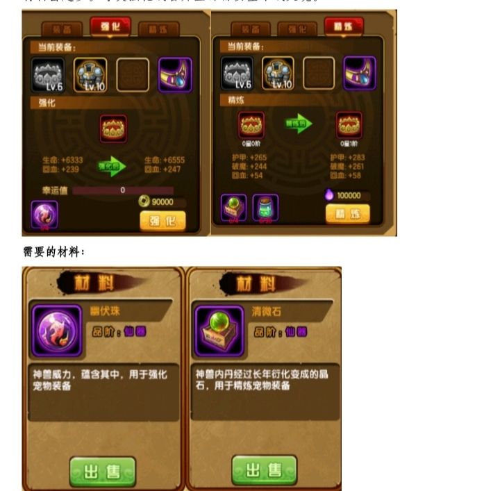 宠物装备:宠物装备既可以从宠物装备箱中开出来,也可以碎片合成。宠物装备箱既可以在斗宠大会中获得,也可以在活动中获得。装备碎片可以在斗宠大会的商店里购买。宠物装备分仙器、圣器和神器。可以强化和升星。不同品质的宠物装备所需强化的材料或者是升星的材料的数量是不同的,装备品质越高,所需要的材料会越多。每次强化或者升星都需要金币或灵魂。