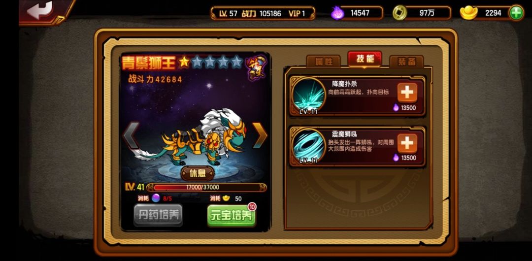 青鬃狮王:降魔扑杀,向前高高跃起,扑向目标;震魔嘶吼,抬头发出一阵嘶吼, 对周围大范围内造成伤害。