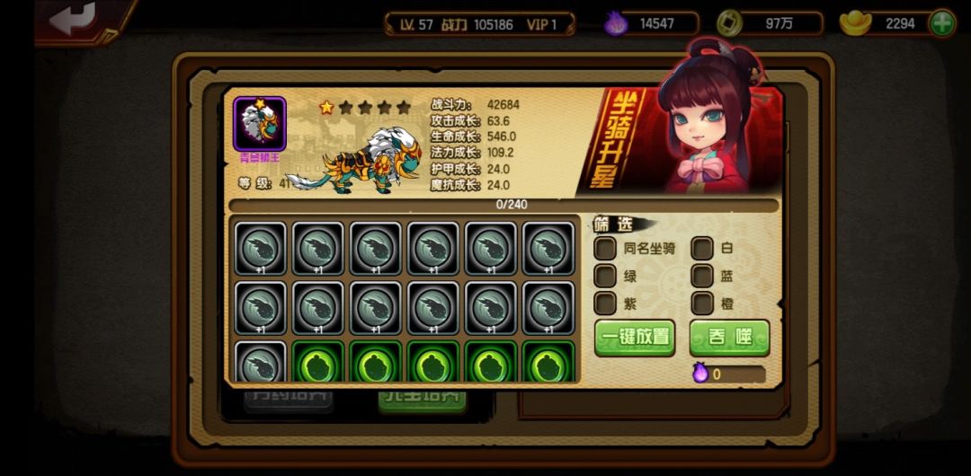 升星:点击坐骑图片上方升星可以进入这个界面,通过吞噬材料和其他坐骑可以