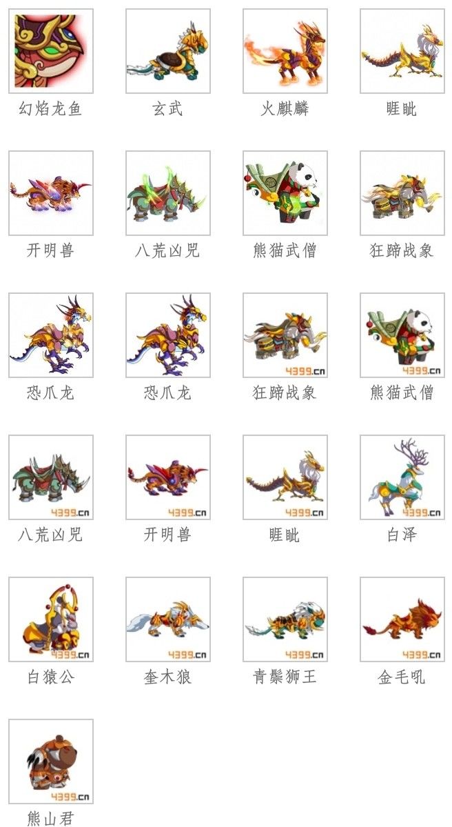 目前造梦中共有 15种坐骑,分别是熊山君、金毛吼、青鬃狮王、奎木狼、白猿公、白泽、恐爪龙、狂蹄战象、熊猫武僧、八荒凶兕、开明兽、火麒麟、玄武、 睚眦、幻焰龙鱼,在锁妖塔中可以获得前五种坐骑(熊山君、金毛吼、青鬃狮王、 奎木狼、白猿公)。其中,后两种奎木狼和白猿公是有三种技能的坐骑,我觉得三种技能的坐骑和两种技能的坐骑的区别,就和仙器圣器的区别那样,所以当然攒攒资源来培养好的坐骑了。下面的这个图就是目前 15种坐骑的图片