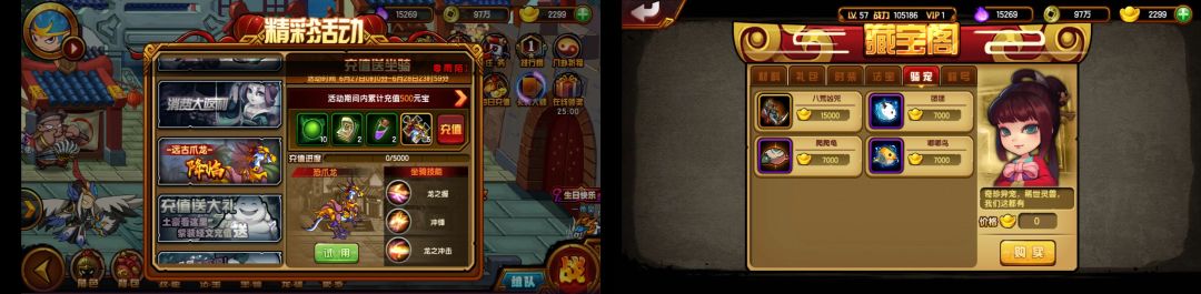 在上面一段话中,我提到可以在锁妖塔中收货坐骑,那么除了锁妖塔还有哪里可以收获坐骑那?还有老君祈福、老板娘处买碎片、充值赠送、藏宝阁购买和可以肝的活动。有图为例: