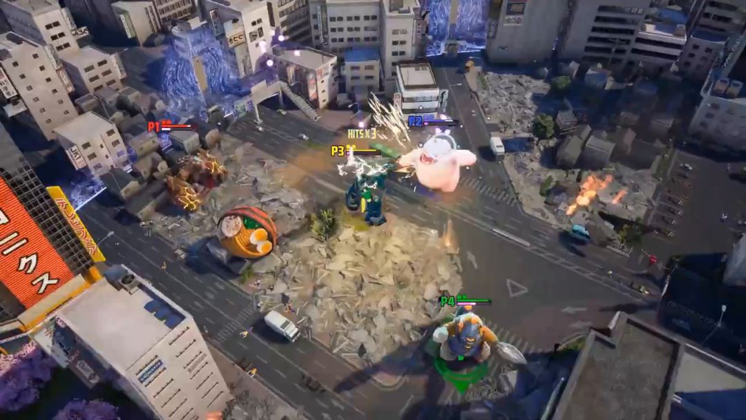 《GigaBash 巨击大乱斗》最大的优势在于,它既有直观易懂的操作,也有熟悉之后才能慢慢发现的深度,并且两者之间达到了良好的平衡。每个角色都有一个基础攻击和一个特殊攻击,这两种攻击还有蓄力版、空中版和空中蓄力版,在此之上还有两个专有能力,操作方法是按住格挡的同时再按一个键。除此之外也有一个闪避键,还可以使用闪避攻击追击敌人,然后还有个拾取键,可以用来将敌人、物品乃至高楼大厦抬起来,然后再扔出去。讲到这里,游戏的操作方式基本就说完了。