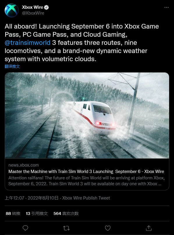 今天(8 月 10 日)微软 Xbox 官方宣布,即将于 9 月 7 日发售的游戏《模拟火车世界3》将于首日加入 Xbox Game Pass 和 PC Game Pass。这意味着订阅用户无需购买游戏即可免费开玩。