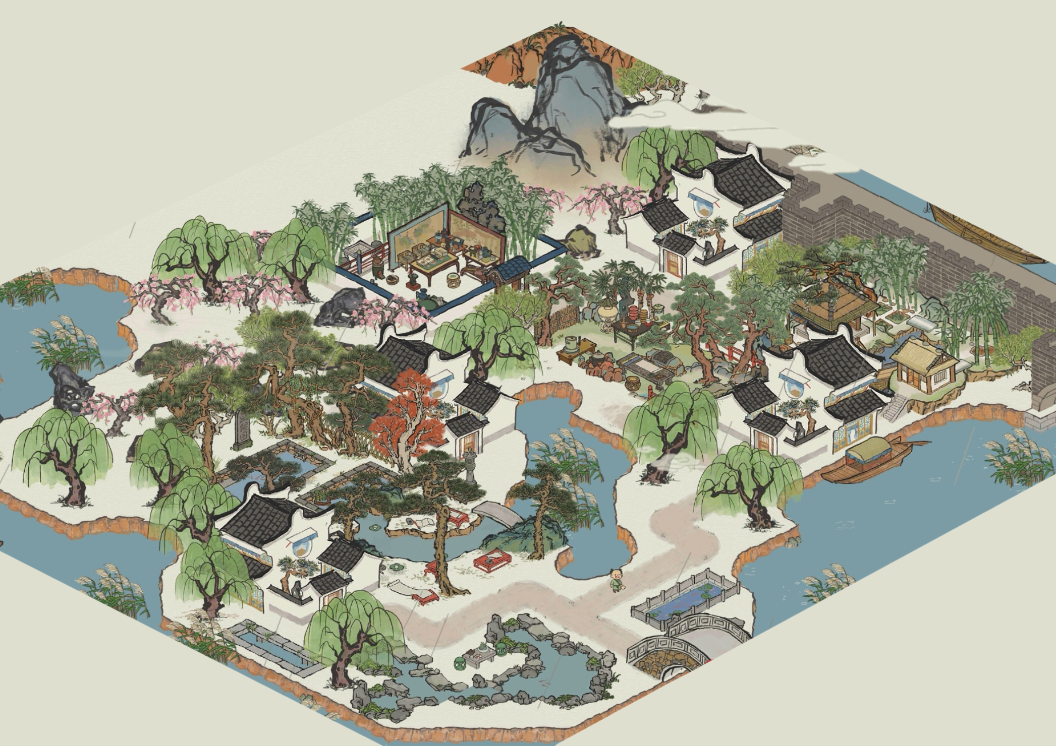 城外青草坞和棠梨坞的这处风景太过美丽,吸引了四户人家在这定居,各家都保持着不远不近的距离,这大概是最舒服的社交距离了。(不过这里大多用的是补天石布的景)