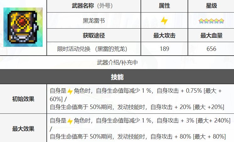 黑龙雷书,雷背水武器,本身不能说没用,但是当雷背水队伍构筑组建齐全之后,新的武器已经实装,导致这个武器最终没能进入完全体的雷背水队伍