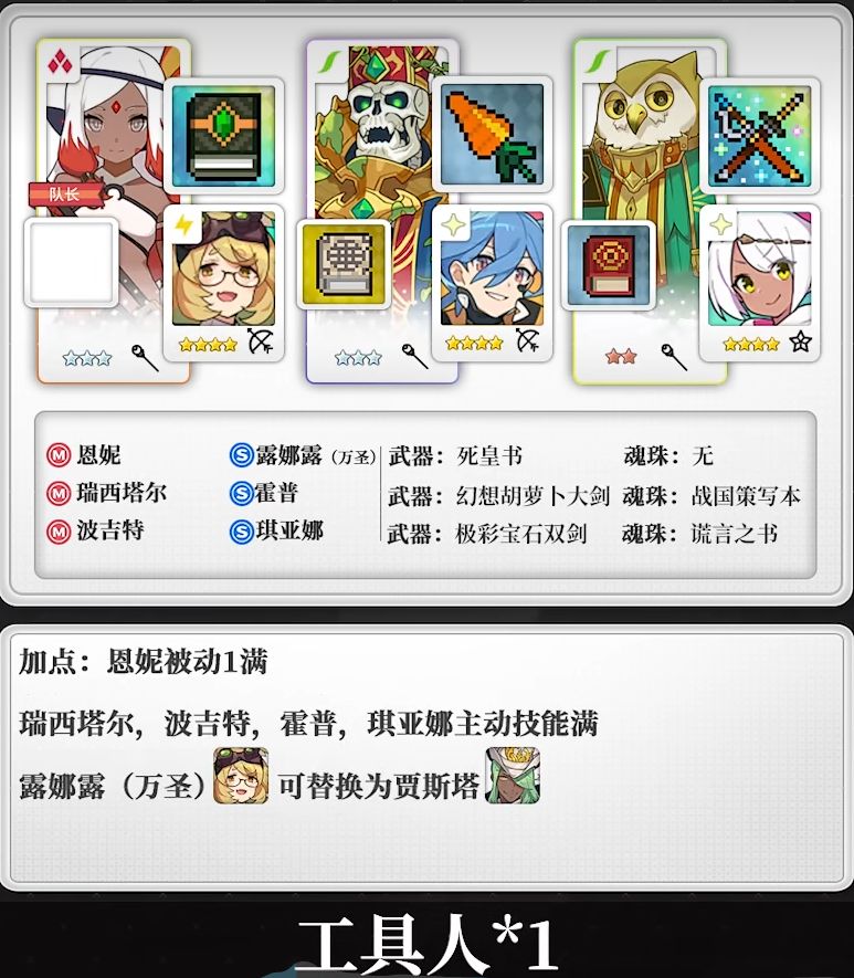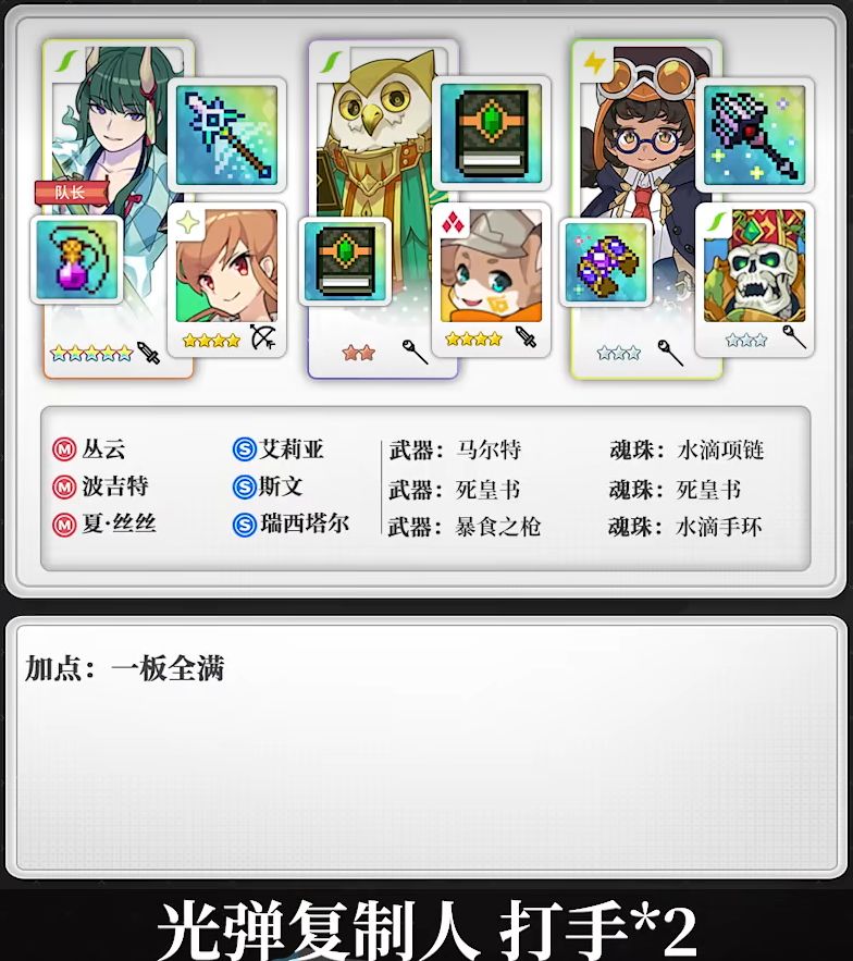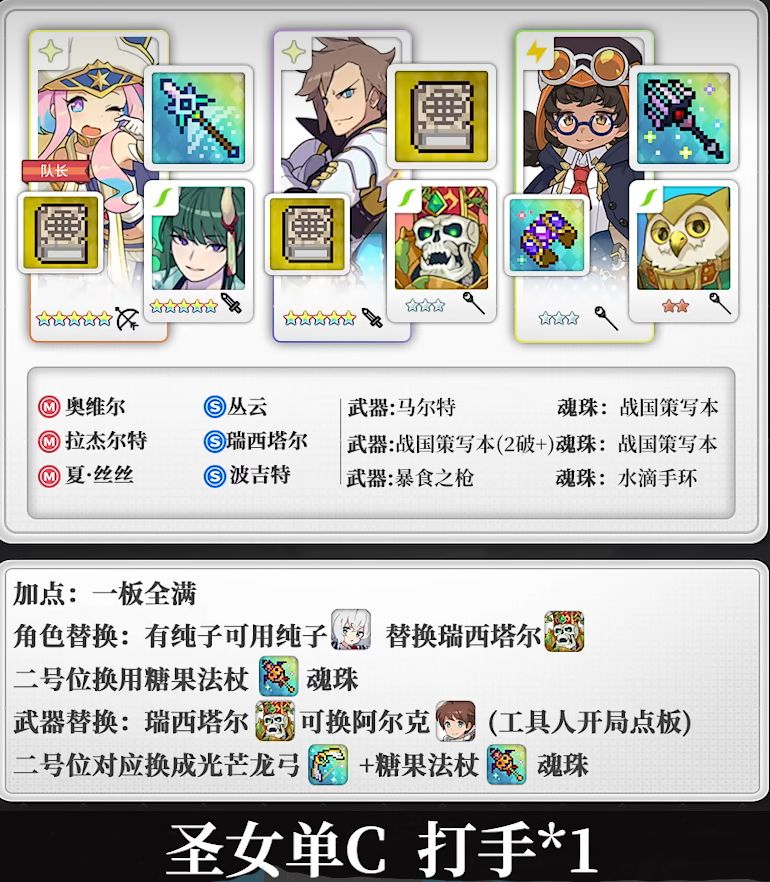 前面有提到本次活动只能踢高加难度,但是作为复刻boss,本次高加难度依旧是第一次出现时的难度,所以对于萌新来说相当友好,各种上古时期的踢罐队伍都可以完成踢罐,圣女队伍更是可以做到单c双人完成踢罐,作为简单暴力的代表,我这里只放出两个配置