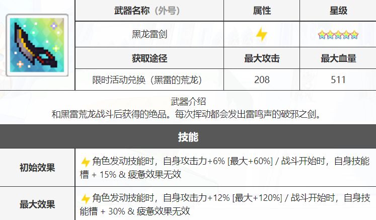 黑雷龙剑,雷荒龙第一次出现时的武器,目前常规雷队已经很少用到,但是其开局自充30%可以用作一些队伍的调轴,疲惫效果无效有时也可以用来针对boss