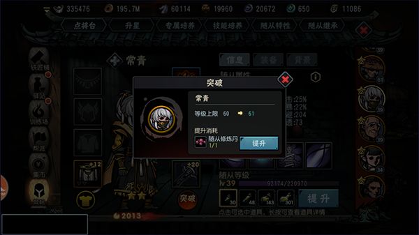 1.新增随从等级上限最高至65级,需要使用道具“随从修炼丹”突破提升(注:突破只用于提随从等级上限,并不作用提升随从经验),随从等级上限不可超过主角。“随从修炼丹”可从元宝商城购买或者60级深渊地图“深渊旧影”掉落。