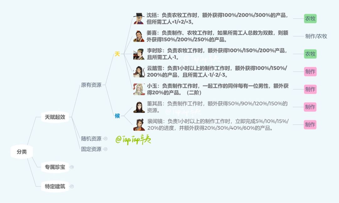 下午好呀各位~我又掏出了祖传的思维导图摸了一个攻略。根据【天赋】【专属珍宝】【特定建筑】进行了分类,大家可以根据需求来培养特殊居民(攒碎片--松江采灵画坊)