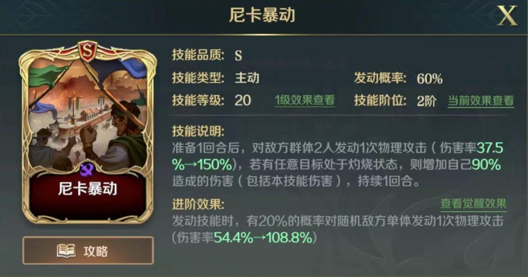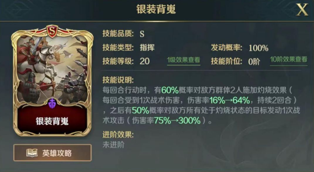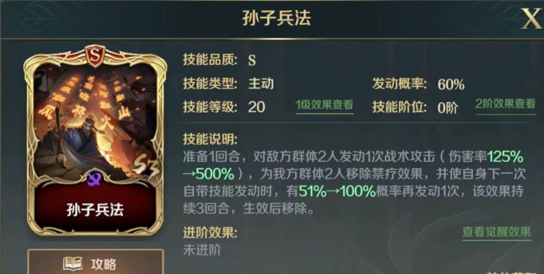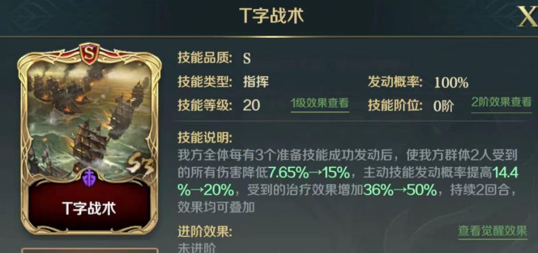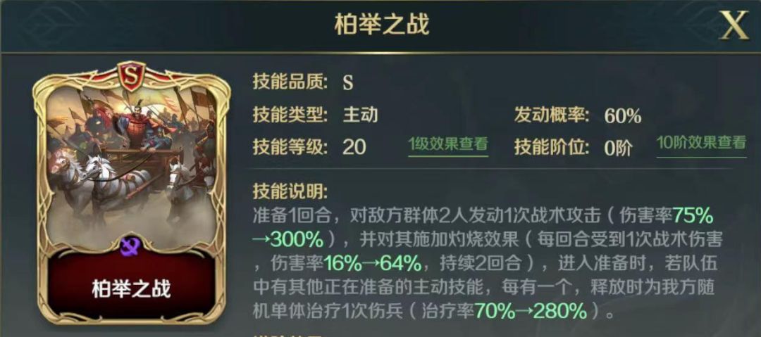 前三回合,每回合都会提高主将和随机副将主动技能发动概率,对准备技能有更高的效果,可叠加。这个技能几乎就是为准备队量身打造的,在准备技能比较多的环境中拥有着非常巨大的辅助效果。