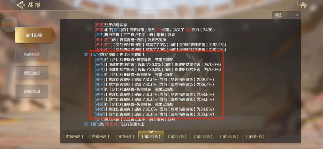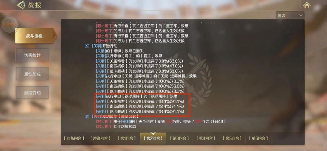 孙武在【普鲁士参谋部】以及【铁浮屠阵】的概率加成效果下,在第二回合,自带技能的发动概率就已经叠加到了将近100%的恐怖数值。
