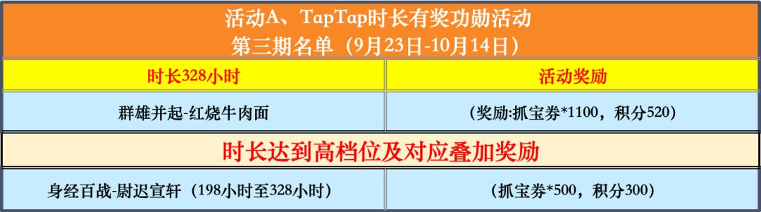 🎁活动A、TapTap时长有奖功勋活动(达成必100%得功勋礼包)第3期(9月23日-10月14日)开奖啦,恭喜以下主公获奖!