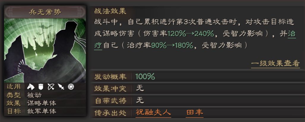 总结来说,兵无常势适具有连击能力且智力尚可的武将(吕布就算了,智力偏低)或是需要自保能力、活的越久输出越高的智力型武将,该战法适用于拖回合队伍。