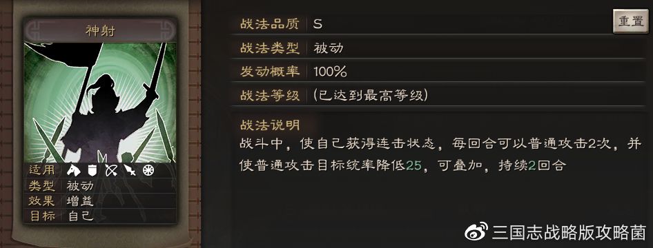 该路线主打辅助输出,神机是核心中的核心,说是为了它才选择这条兵书路线都不为过。通常【折冲御侮】战法必带,神机就是为了抢先一步护主。