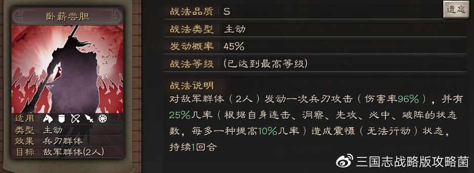 该战法让他能够每回合进行两次普通攻击,搭配强力的突击战法,威力无穷。但太史慈极为惧怕缴械效果,尤其是盛气凌敌这个前两回合稳定缴械指挥战法。建议玩家在战场上多查看同盟战报,避开携带盛气的敌方队伍。