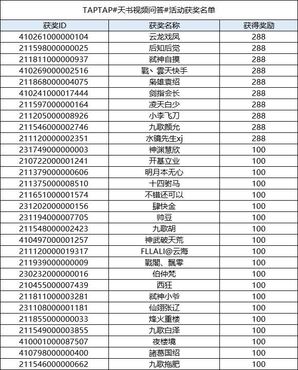 恭喜以下主公获得本次活动奖励,奖励会在7个工作日内发布到对应的ID邮箱内,请注意查收