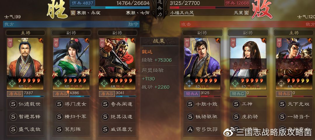 2)持续全场的自我伤害增幅;可以和【乘胜长驱】【虎据鹰扬】【武锋阵】叠加生效。这个成长不明显,受制于战法的发动和结算达成,每场叠加的次数并不多,都集中在战斗中后期。