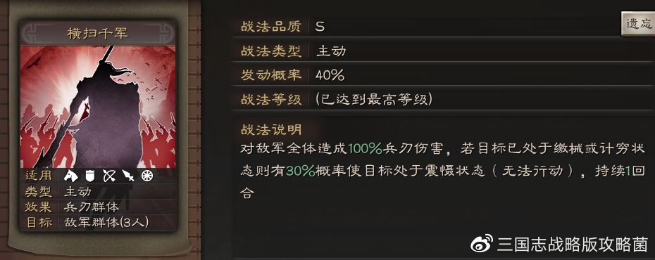 战斗中,武将行动时有一定概率发动的战法,分需要准备和无需准备两种。战法生效优先度为第五位,在被动、阵法、兵种及指挥战法后生效。