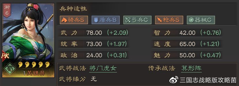 在属性上,身为女性兵刃武将的关银屏(以下简称:关妹),其四围基础属性和成长都在水平线之上,其战法的霸道着实让人闻风丧胆。