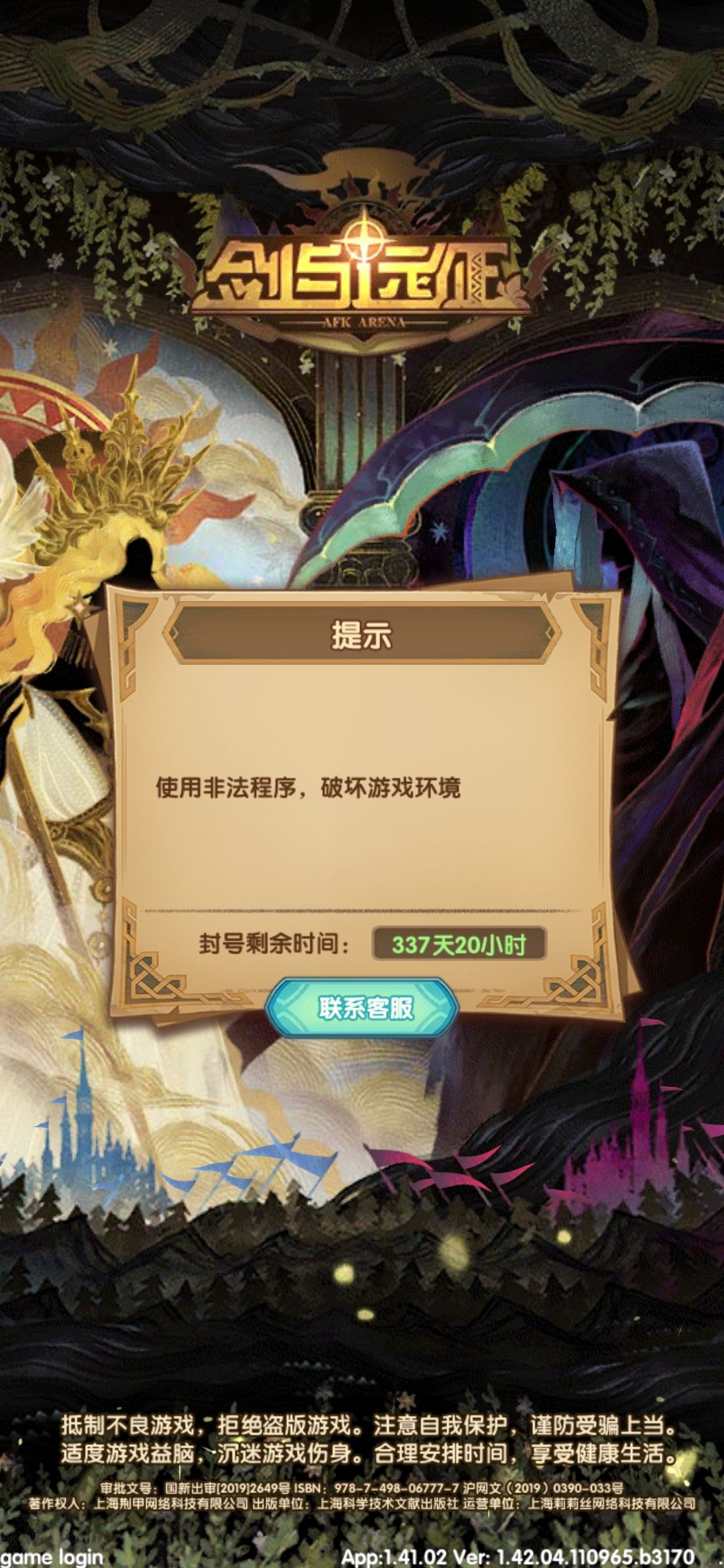 切换服务器就封号?推不动关了,切换到其他服务器玩玩,就突然弹出这个,懵逼了。怎么办呀?@塔西 @剑与远征官方客服