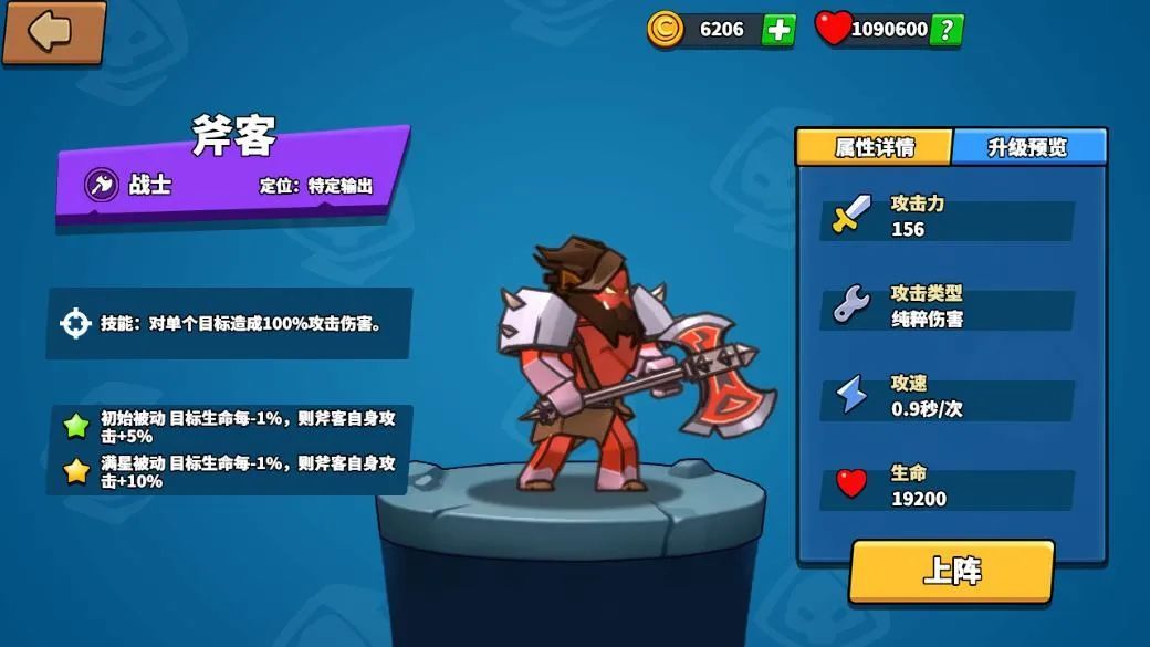 3、斧客作为本阵容的核心输出,是优先升级的目标,其初始被动为目标生命每-1%,则斧客自身攻击+4%;满星被动为目标生命每-1%,则斧客自身攻击+10%。可以粗略计算一下,三战+三猎的情况下,即使是没有刀客加成的1星斧客也拥有3000+的攻击力,在攻打对方战车时可以先放一次雷精灵,减少敌方战车20%的生命值,则斧客第一次攻击可对战车造成5400+的伤害,且随着自身等级的提升和对方战车生命值的下降,单次伤害会越来越高。