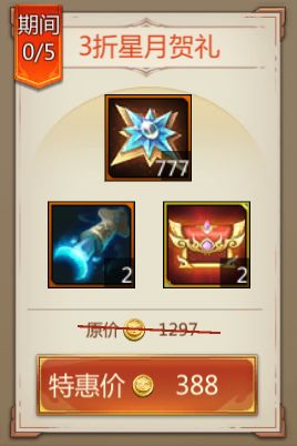 礼包内含星缘*777、月之匙(3天)*2、周年甄选礼盒*2,原价1297梦三币,现价仅需388梦三币,三折特惠超高性价比,活动期间限购5次。