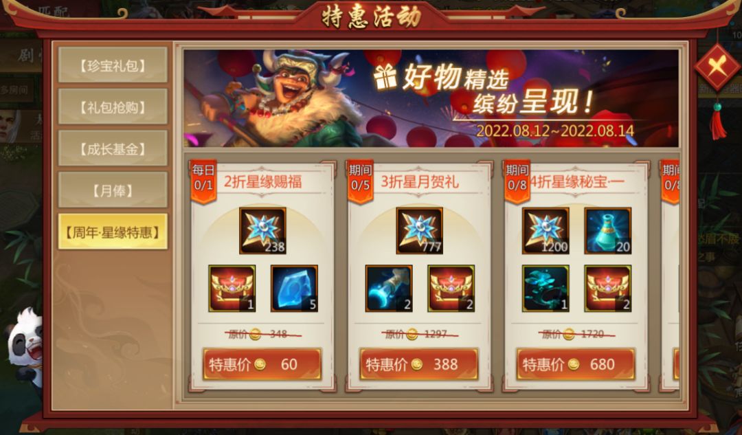 为了帮助大家能尽快获得周年庆共赴嘉年活动的奖励,梦梦带着限时超值的星缘特惠礼包来啦,折扣低至二折,走路路过不容错过!