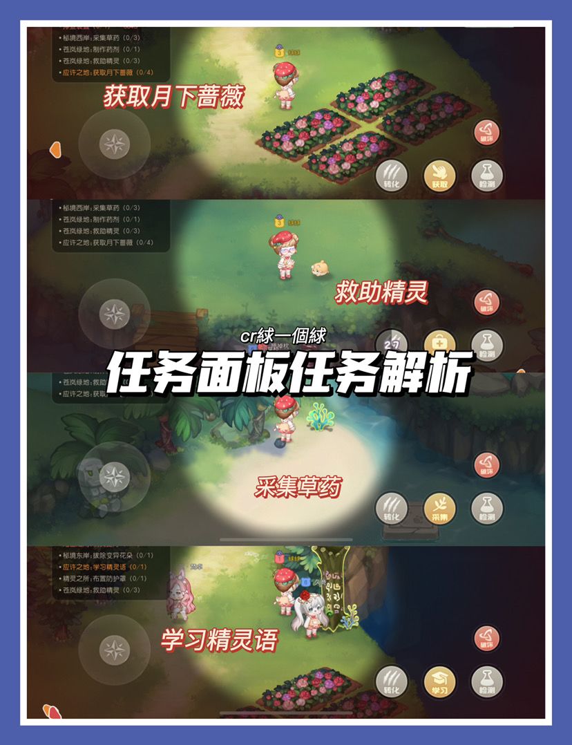 右界面会有任务面板,大家可以根据提示完成(包括获取月下蔷薇采摘,采集草药,救助精灵,学习精灵语)