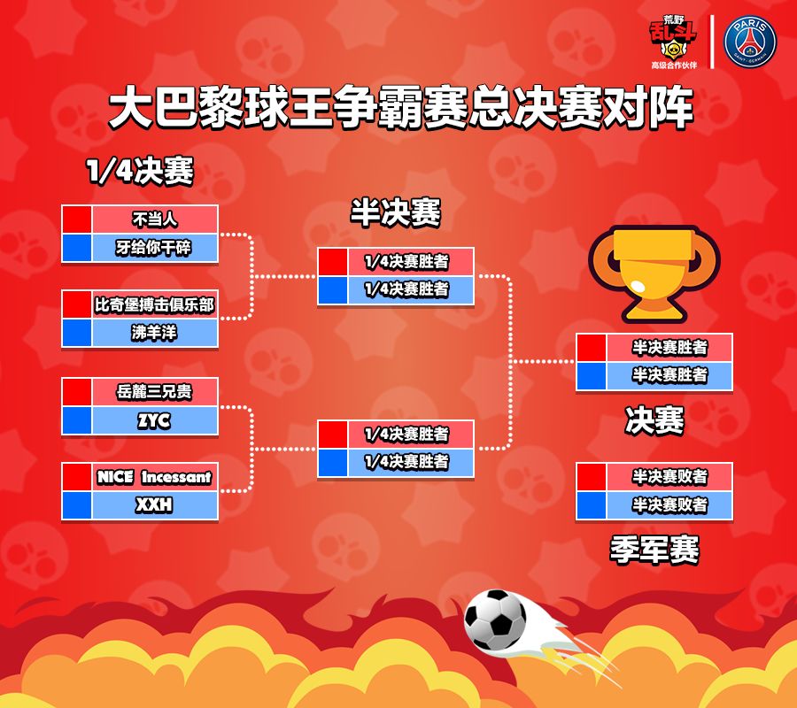大巴黎球王争霸赛线下决赛将采用单败淘汰制,8支队伍将按世界杯淘汰赛一样的刺激赛制展开生死较量。4场8进4的比赛、两场半决赛和三四名决赛均将采用三盘两胜制(BO3),其中每一盘为3局2胜。最后的总决赛则为五盘三胜制,欲成荒野球王,必须层层通关!