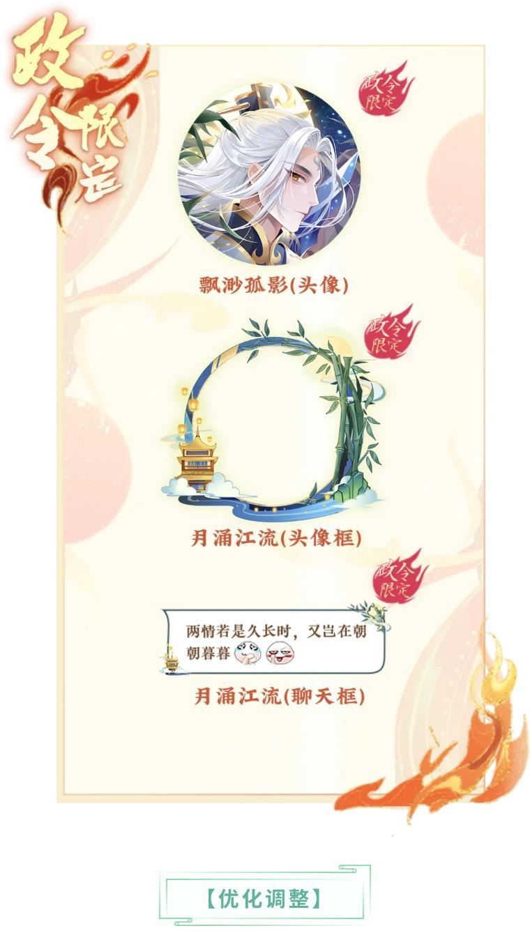 新的一期上凰政令将于8月15日0:00开启,提升政令等级,购买进阶方案,有机会获得全新头像“缥缈孤影”,头像框/气泡框“月涌江流”