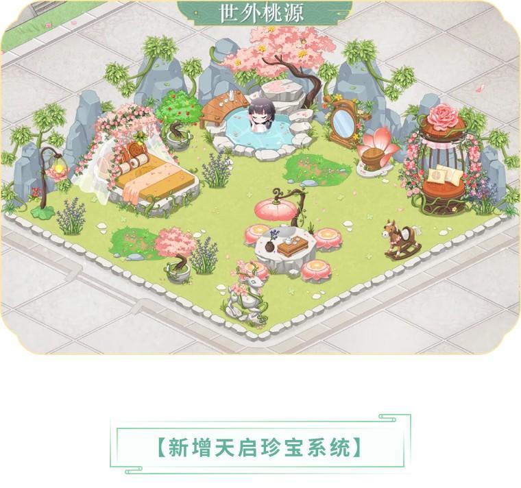 1、世外仙境水连天,桃源景色醉人间!凰家别苑内新增紫色主题“世外桃源”,可于【别苑-商坊】中花费匠心币购买!