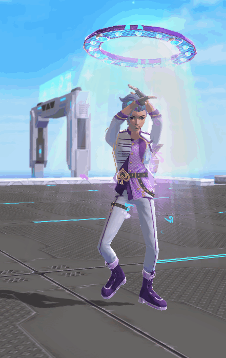 服饰这一次整体为紫色连头发的都是淡紫色中挑染蓝色裙子里还有满满的细节比如琴键的裙摆还有摇滚风格的棋盘格以及腿上的饰品最有意思的是我们这一次的背饰一个炫光在头上,不管你走到哪你都是焦点这个小创君个人太喜欢了!!!而且周身还有音符的特效爱了爱了