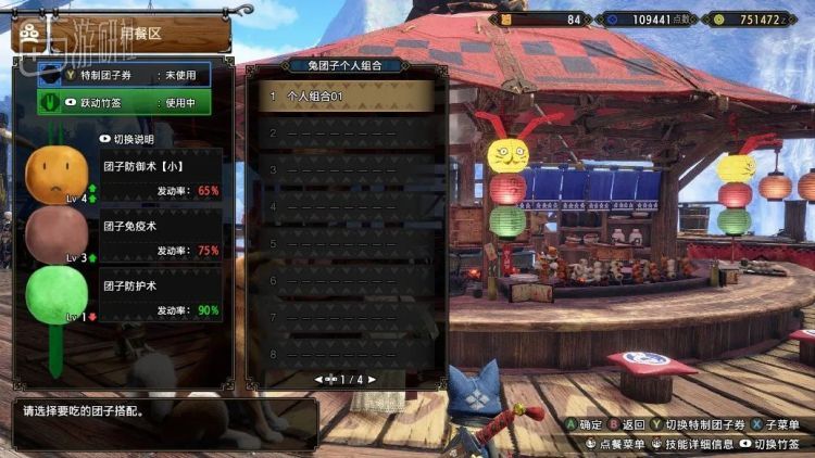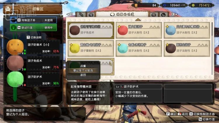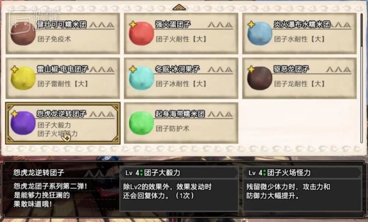 每一种团子都对应着独特的加成效果,而玩家可以自由组合三种团子,获得三种不同的加成。不需要像前作那样考虑各种食材之间的相性和搭配,猎人仅需根据自己的武器和怪物的特性做取舍。