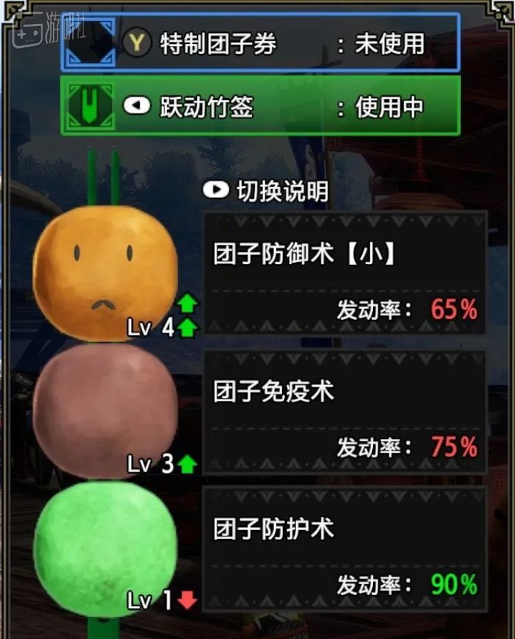 玩家选择的第一个团子会触发4级技能,第二个团子触发3级技能,而第三个团子会触发效果微弱的1级技能。尽管技能发动率也会随着技能等级的提升而降低,但配合原版的消耗品“特制团子券”,就一定能够触发技能。