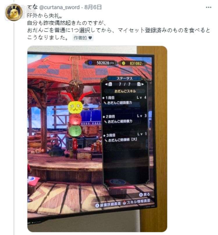 正常情况下,玩家无法选择重复的团子。不过据日本玩家“れみ。”在推特上所公开的情报,资料片《怪物猎人崛起:曙光》更新后产生的一个Bug,允许猎人一次性吃到两份同种类的团子。