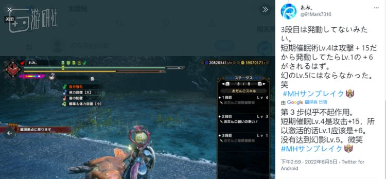“短期催眠术”会在狩猎开始时的一段时间里短暂提升猎人的攻击力与防御力,4级技能提升15点攻击力,而1级技能提升6点攻击力。れみ进入任务后,发现攻击力只涨了15点,这说明4级技能和1级技能并不叠加,游戏只计算4级技能的效果。