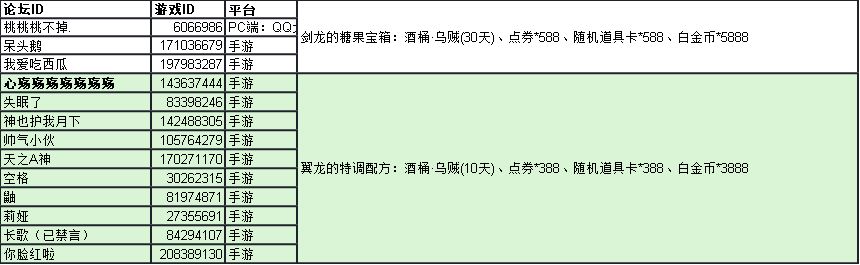 剑龙的糖果宝箱(3名):酒桶·乌贼(30天)、点券*588、随机道具卡*588、白金币*5888